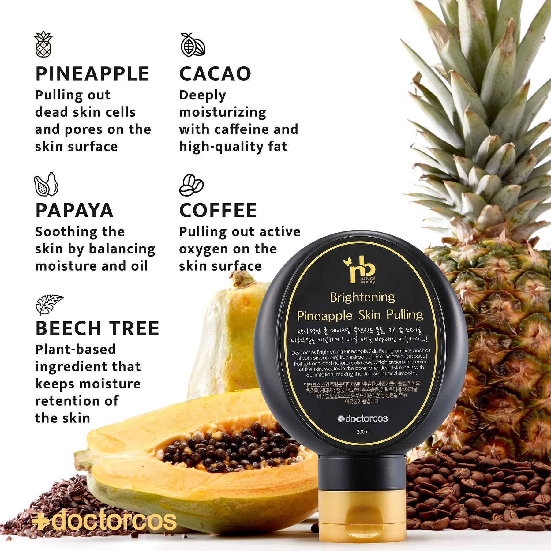 - 💦 NATURAL INGREDIENTS - contains pineapple, cacao, papaya, and caffeine which exfoliates & purifies the skin, while hyaluronic acid moisturizes the skin.