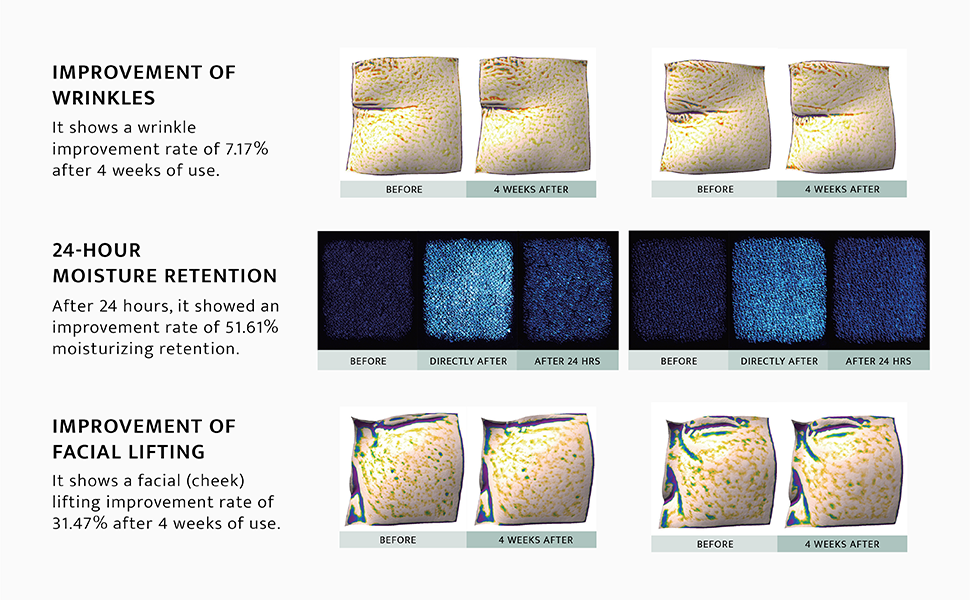 - 💦 CLINICALLY PROVEN RESULTS - *Created by a team of dermatologists *and* *went through a process of 4* additional clinical tests* to prove efficacy *for wrinkle reduction, moisture retention, facial lifting, and skin sensitivity.* *During clinical testing, 2 weeks of use caused *6.03% wrinkle reduction*, and *160% of moisture was retained after 6 hours*!